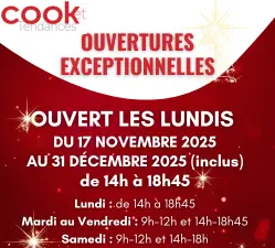 Afin de vous permettre d’anticiper les fêtes ou de vous faire plaisir, notre magasin sera ouvert les lundis après-midi de 14h à 18h45 du 17 novembre au 31 décembre 2025.